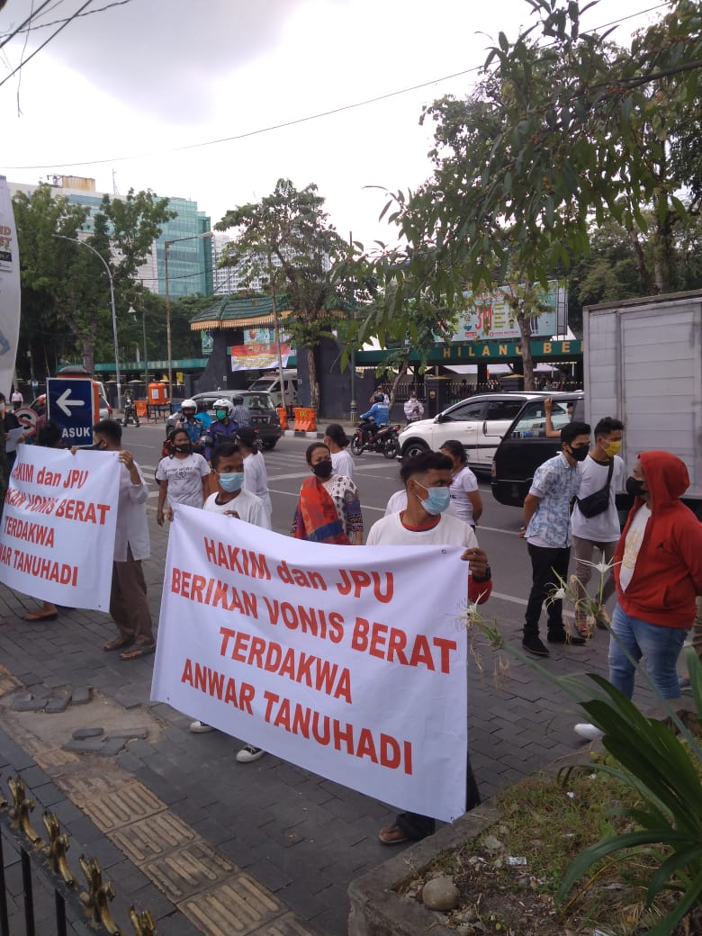 Massa yang mengatasnamakan Masyarakat Pembela Keadilan Sumatera Utara (MPK – SU) menggeruduk Pengadilan Negeri Medan (PN), Rabu (23/6/2021). Massa meminta Majelis Hakim dapat memvonis terdakwa Anwar Tanuhadi dengan hukuman seberat-beratnya, kemudian bisa secepatnya dipenjarakan terdakwa yang melakukan penipuan dan penggelapan uang sebanyak Rp 4 miliar kepada korban Joni Halim. “Saya harapkan Majelis Hakim PN Medan dan Jaksa bisa memberikan hukuman seberat – beratnya kepada Anwar Tanuhadi, ” ucap kordinator aksi MPK – SU Tri Joko Juliadi dalam orasinya di depan pintu masuk PN Medan.