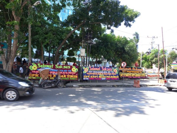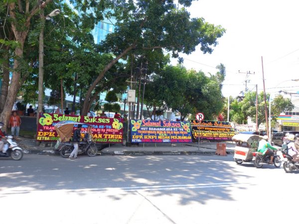 Karangann bunga ucapan Dirgahayu HUT Bhayangkara itu datang dari sejumlah instansi dan perusahaan, tertata berjajar rapi di depan Mapolsek Medan Timur. Bahkan, bukan hanya satu atau dua tetapi puluhan beberapa karangan bunga terpampang berderet.