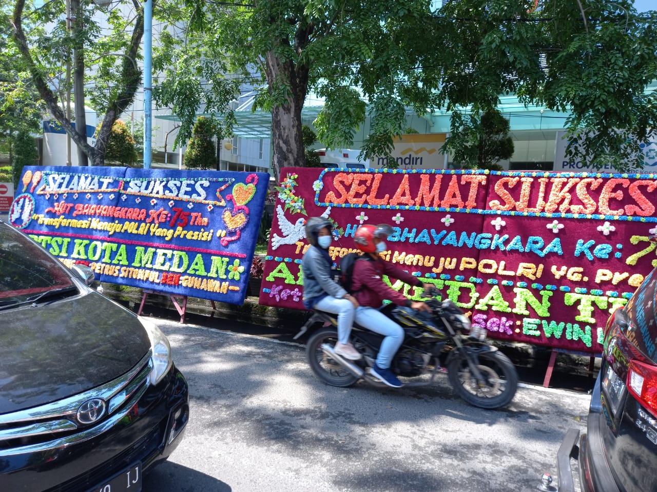 Menjelang Hari Ulang Tahun (HUT) ke 75 Bhayangkara pada 1 Juli 2021, Polsek Medan Timur ‘kebanjiran’ papan bunga ucapan HUT Bhayangkara.