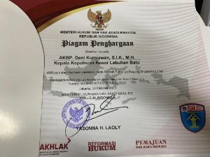 Pada piagam penghargaan berdasarkan Keputusan Menteri Hukum dan Hak Asasi Manusia Nomor: M. HH.07.KP.08.05 Tahun 2021 tertanggal 30 Oktober 2021 yang langsung ditandatangani oleh Menteri Hukum dan Hak Asasi Manusia, Yasonna H Laoly diberikan kepada AKBP Deni Kurniawan selaku Kapolres Labuhanbatu.