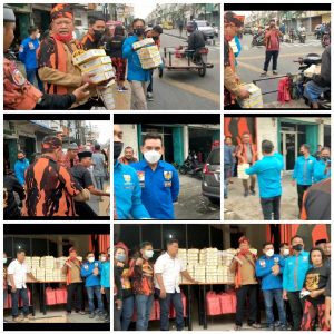 Ketua PAC PP Medan Area, Joko Tarigan berkolaborasi bersama Ketua KNPI Medan Area, wendy Melia Tanjung dan Bung Satria Siregar yang merupakan calon tunggal Ketua KNPI Medan Area berbagi nasi kotak kepada abang becak, ojol serta supir angkot di depan kantor MPC PP Kota Medan Jalan Sutrisno dan sekitarnya, Jum’at (3/12/2021) siang.