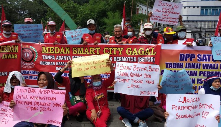 Ratusan abang betor (becak motor) yang tergabung dalam DPP Satu Betor menggelar unjuk rasa di depan kantor Wali Kota Medan Jalan Kapten Maulana Lubis, Selasa (7/6/2022).