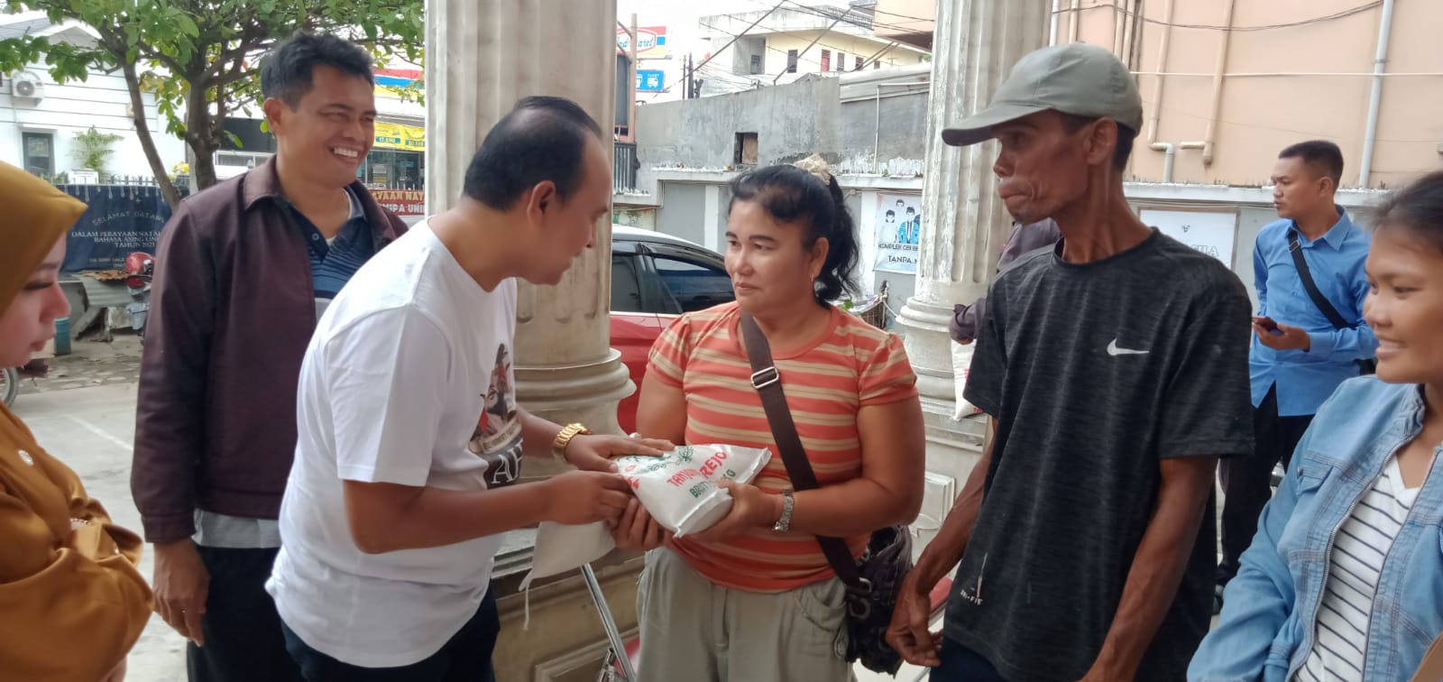 Dalam kesempatan itu Ketua Forkolimat Kota Medan ini membagi satu persatu karung beras kepada jemaat gereja. Ia pun menitipkan pesan agar tetap menjalani kehidupan dengan semangat.