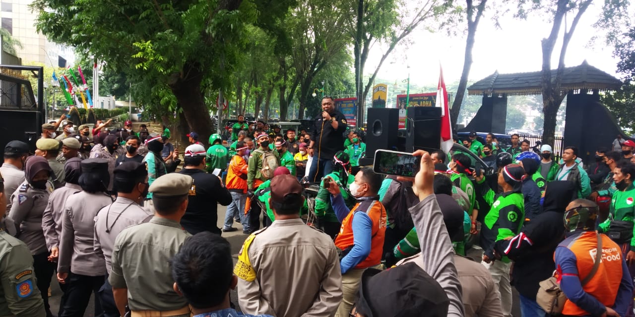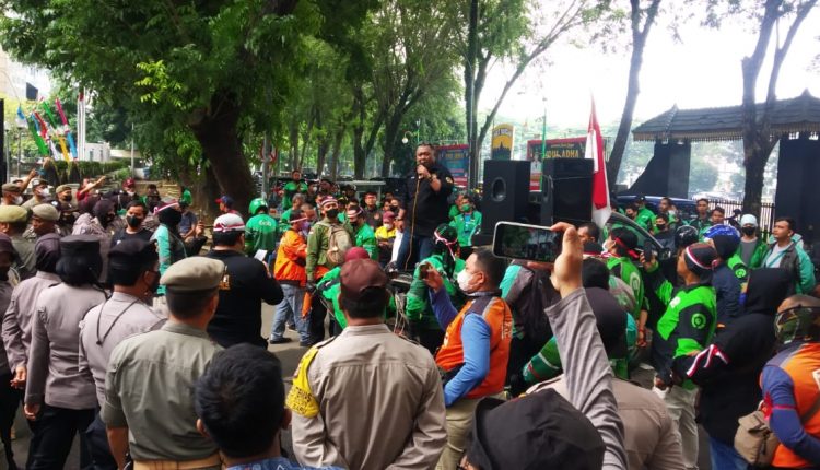 Ratusan pengemudi yang tergabung pada Asosiasi Ojek Online (Ojol) Gabungan Aksi Roda Dua (Garda) Regional Sumut, menggelar aksi di DPRD Sumut, Selasa (2/8/2022).