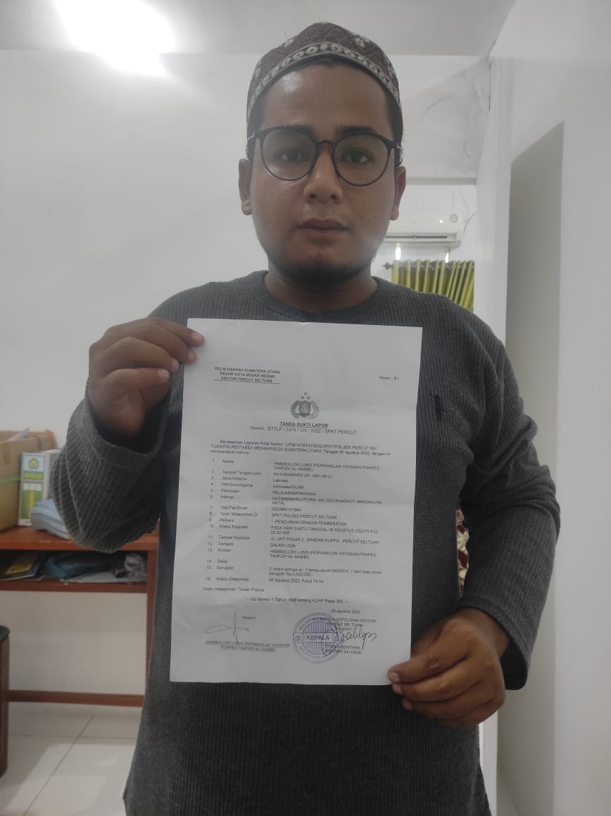 Habibollah Lubis (40), perwakilan dari Yayasan Pondok Pesantren Tahfizh Al Habibi, melaporan pengaduan ke Polsek Percut Sei Tuan. Dia berharap laporan pengaduan bernomor LP/B/1479/VIII/2022/SPKT/Polsek Percut Sei Tuan, ini ditindak lanjuti dengan menangkap para pelaku yang kerab meresahkan warga dengan berbagai aksi pencurian yang mereka lakukan selama ini.