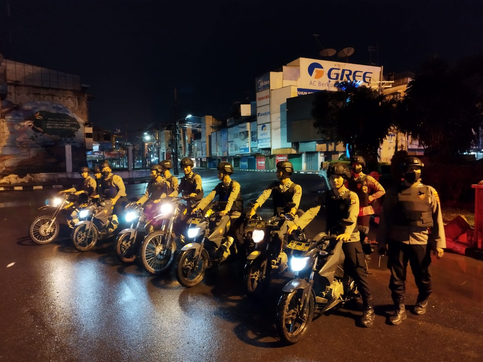 Personel Sat Samapta Polrestabes Medan dan Polda Sumut, membubarkan kerumunan warga dan melakukan pemeriksaan terhadap pengendara sepeda motor yang diduga tidak memiliki kelengkapan surat-surat.