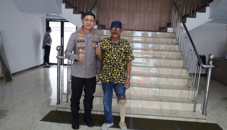 Kapolrestabes Medan Kombes Pol Valentino Alfa Tatareda memberikan bantuan kaki palsu kepada penyandang disabilitas bernama bapak Yunus di Mapolrestabes Medan, Rabu (31/8/2022). Kegiatan itu juga peduli kepada warga lumpuh di Medan sekaligus dalam rangka HUT Bhayangkara ke 77. Hadir dalam kegiatan itu Ketua MUI Kota Medan Hasan Maksum, Kabag Ops Polrestabes Medan AKBP Arman Muis,S.H,S.I.K, M.M, Kasat Binmas Polrestabes Medan AKBP Drs Efendi Sinaga, Kasat Intel Polrestabes Medan AKBP Ahyan,S.sos, M.M dan Kasi Humas Polrestabes Medan Kompol Riama Siahaan, SE.