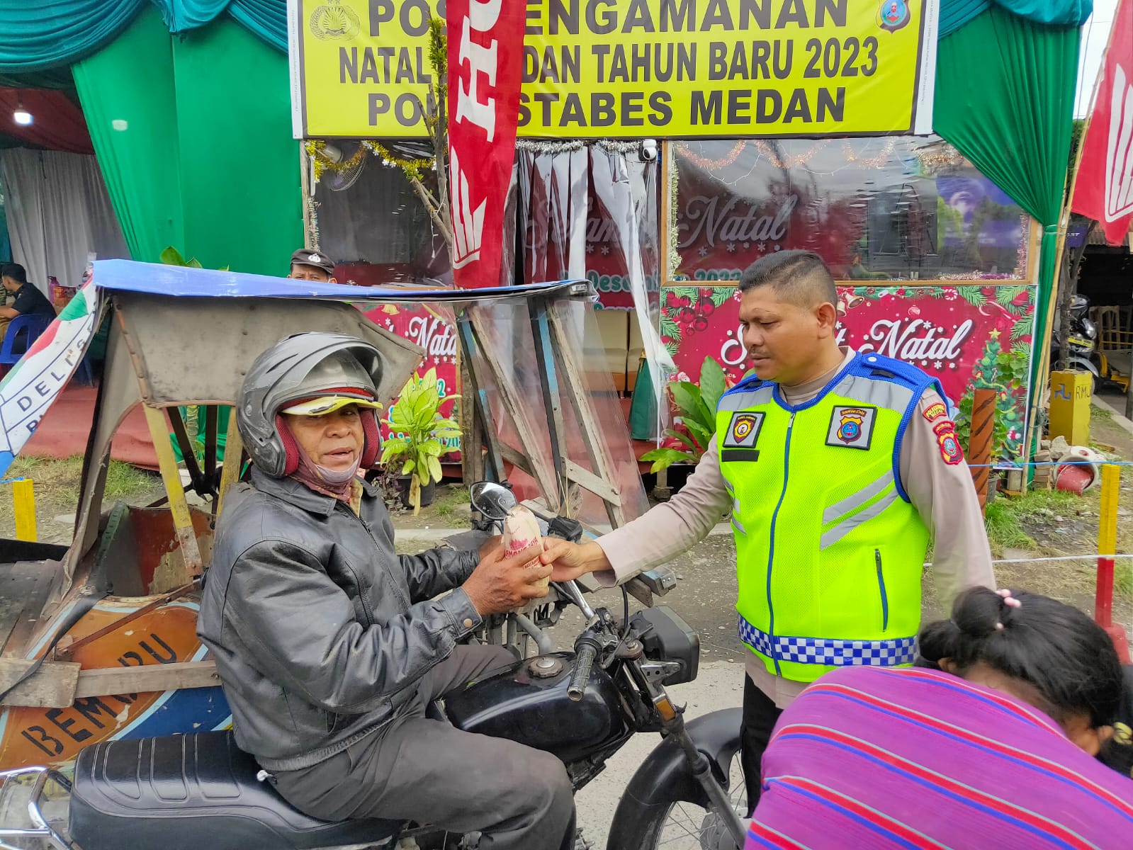 Disela-sela melaksanakan pengamanan (pospam) dalam rangka Ops Lilin Toba 2022, personil Polsek Percut Sei Tuan tetap melakukan kegiatan Jumat Barokah dengan membagikan nasi bungkus kepada para abang becak di seputaran Pospam15 Cemara H Anif, Jalan Cemara Simpang BW, Jumat (30/12/2022) siang.