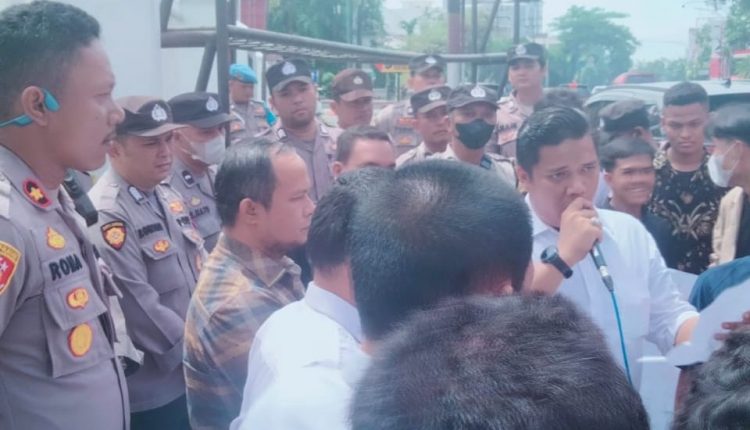 Polrestabes Medan kawal Demo dilakukan oleh Massa Aliansi Kawal Pemilu di Kantor Bawaslu Sumut Jalan H Adam Malik dan Kantor KPU Sumut Jalan Perintis kemerdekaan Medan, Senin (3/7/2023). “Aksi unjuk rasa berjalan aman dan kondusif, ” ucap Kapolrestabes Medan Kombes Pol Valentino Alfa Tatareda kepada wartawan di Medan.
