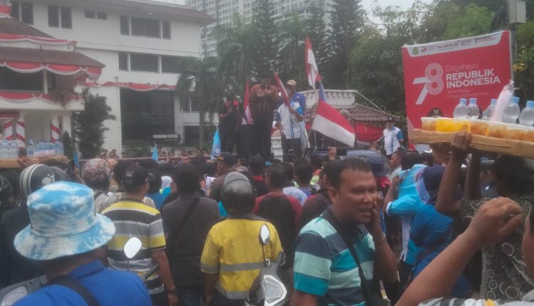 Ratusan buruh berbagai gabungan dari Serikat Pekerja Seluruh Indonesia (SPSI) Sumut dan Medan kembali melakukan aksi demontrasi di depan Kantor Wali Kota Medan, Kamis (10/8/2023).