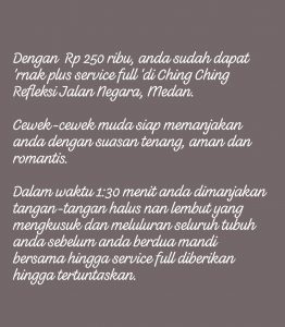 Dengan cuan Rp 250 ribu, anda sudah dapat enak plus service full di Ching Ching Refleksi Jalan Negara, Medan.