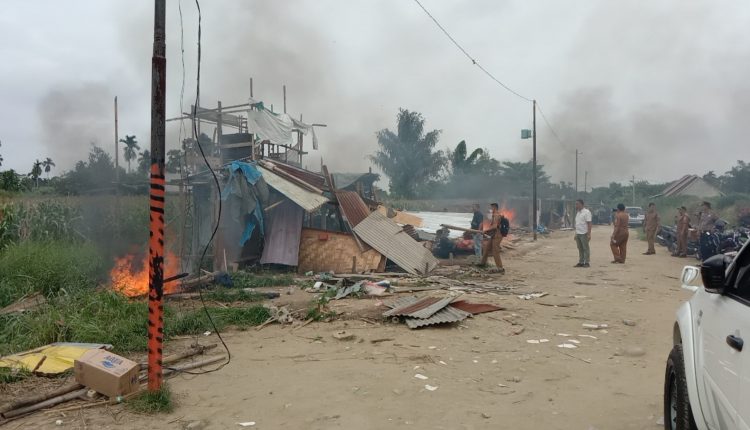 Polsek Percut Sei Tuan bersama Danramil dan Muspika melakukan pembongkaran gubuk yang di duga tempat pengedaran dan pemakai narkoba di Jalan Jermal XV Desa Amplas Kec. Percut Sei Tuan,Selasa (12/12/2023).