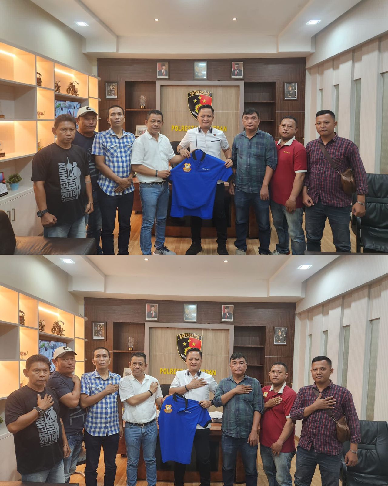 Beri rasa aman dan nyaman Tim URC Polrestabes Medan Gerak Cepat Cegah Begal dan Kejahatan Jalanan “Ketua Pewarta berikan baju kaos pewarta”
