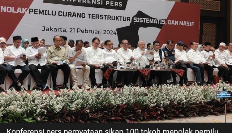 Sebanyak 100 tokoh menyatakan penolakan terhadap hasil Pemilihan Presiden (Pilpres) 2024 karena dinilai curang secara terstruktur, sistematis dan masif (TSM). Pembacaan sikap penolakan dipimpin oleh mantan Ketua Umum Pimpinan Pusat (PP) Muhammadiyah Din Syamsuddin di sebuah hotel kawasan Jakarta Pusat, Rabu (21/2/2024).