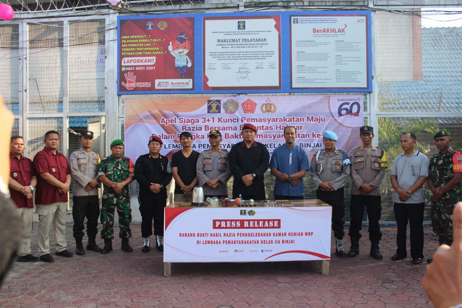 Adapun APH yang hadir, yaitu Kepolisian Resor Kota Binjai, Kodim 0203/Langkat dan BNN Kota Binjai. “Demi mencegah gangguan keamanan dan ketertiban (kamtib) di Lapas, razia gabungan ini kami laksanakan sebagai bentuk deteksi dini menjelang Hari Raya Idul Fitri dan sekaligus merupakan implementasi dari Tiga Kunci Pemasyarakatan Maju, yaitu deteksi dini, cegah peredaran narkoba, dan sinergi dengan APH serta Back to Basic,” tegas Kepala Lapas Binjai, Theo Adrianus, seraya berharap seluruh pihak terus menjaga komitmen dan integritas demi tercipatanya Lapas Binjai zero handphone, pungutan liar, dan narkoba.