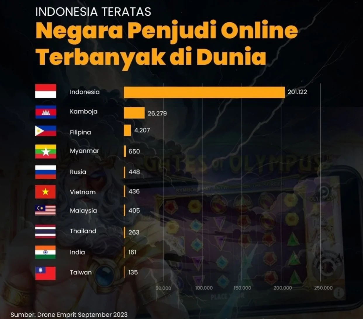 Diketahui, daftar jumlah pemain judi online itu, bersumber dari Drone Empirit pada September 2023. Sistem monitor dan analisis media sosial.