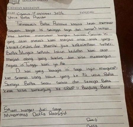 ANAKMEDANBUNG.com : Seorang siswa Sekolah Rakyat Menengah Pertama (SRMP) II Bandung Barat menulis surat kepada Presiden Prabowo Subianto.